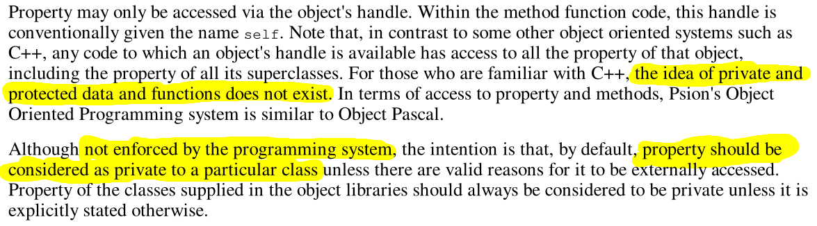In spite of my discomfort with the tooling, Psion OO ecosystem is a fully object oriented, event driven “language.” It’s not so much a superset of C, but a separate class-definition language with some extra C functions to handle methods. In the Object Oriented Programming Guide, they say: