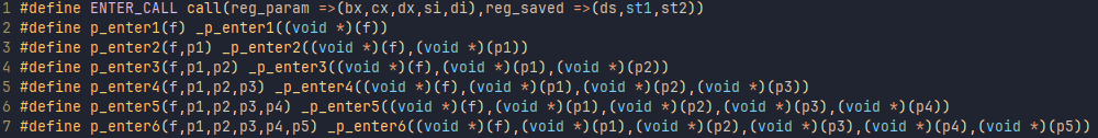 TopSpeed C uses its own “callee clean-up” calling convention, using registers for the first 4 int parameters. The SDK regularly mentions that this method is much faster, and might also fit better with the way that EPOC16 manages memory. Sticking with the “pure” small memory model (preserving the CX register) means that 64K code and data blocks can be moved around memory without interfering with the program running “within.”