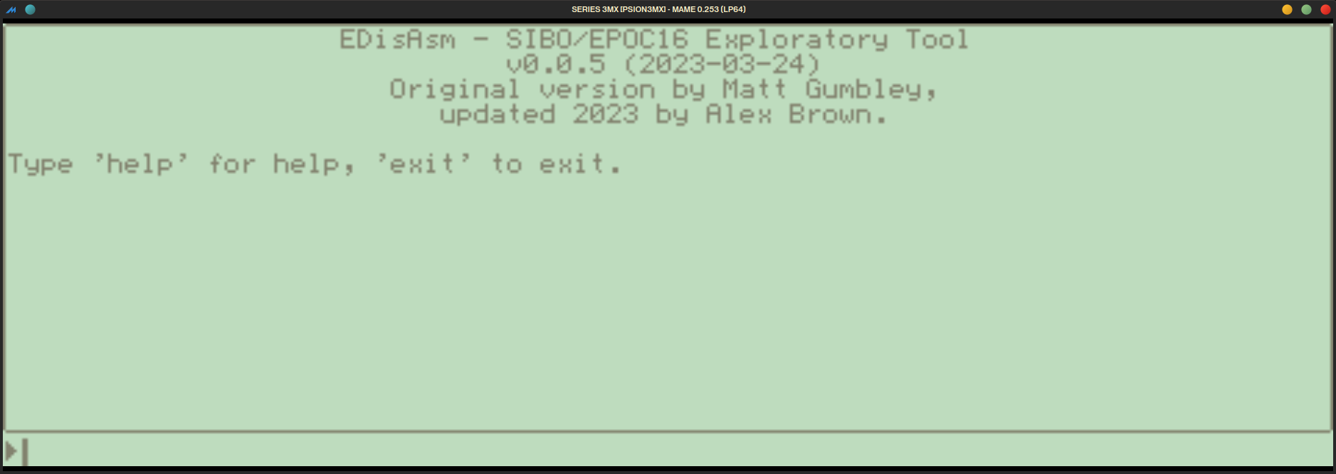 EDisAsm was a project by Matt Gumbley. The original aim was for it to become an EPOC16 disassembler, but it never quite reached that stage. However, it is a great tool for poking around the memory of a SIBO machine. It could also dump the memory of a SIBO machine over serial, including the EPOC16 ROM. (Bear this in mind for later.)